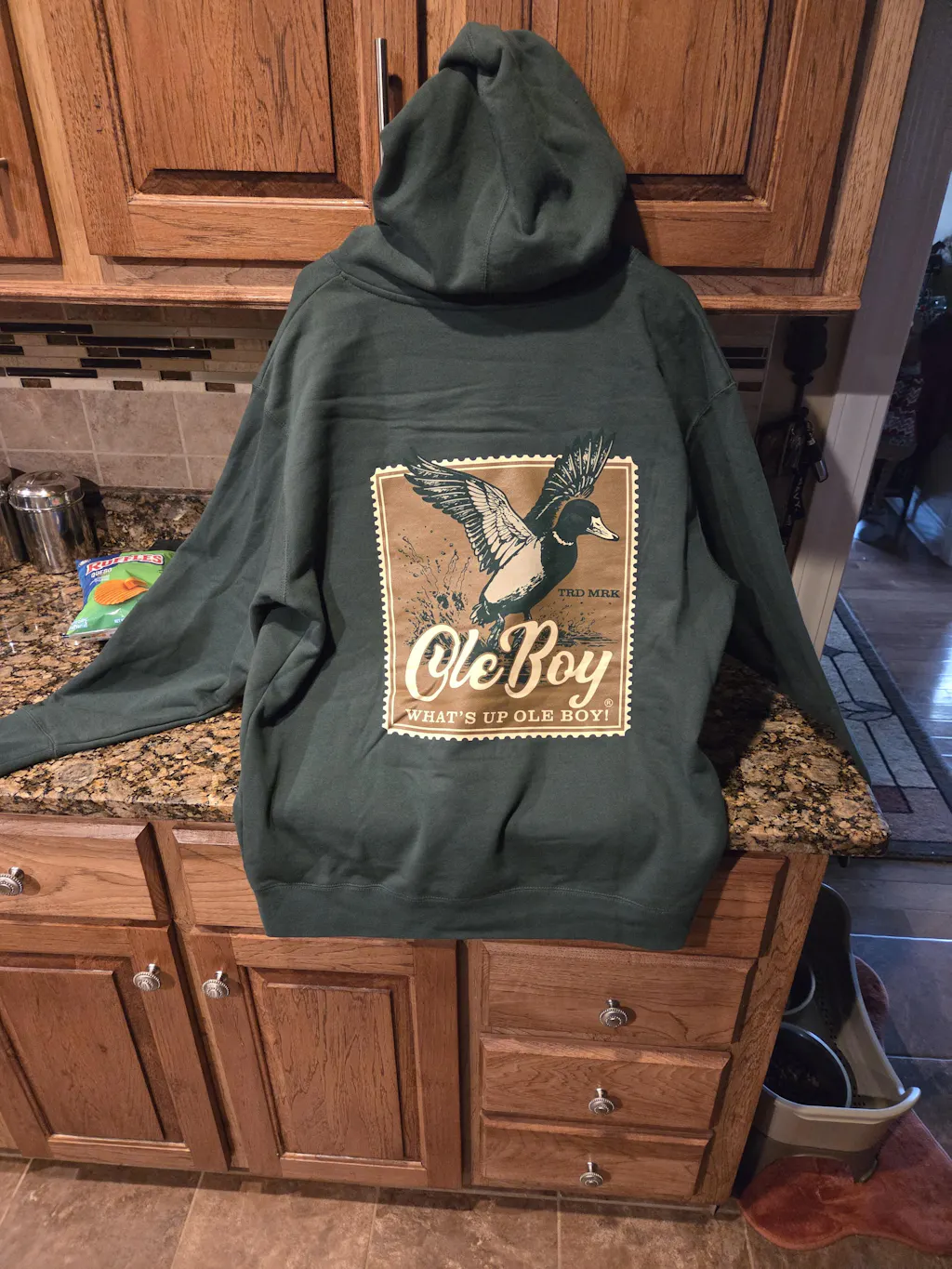 Celebrate your love for the outdoors with the OLE BOY Duck Stamp Hoodie. Featuring the trademarked "What's Up Ole Boy" phrase alongside a striking mallard duck design, this shirt blends rugged style with a nod to waterfowl heritage. Perfect for hunting trips or casual wear, it’s a comfortable way to show your Ole Boy pride.