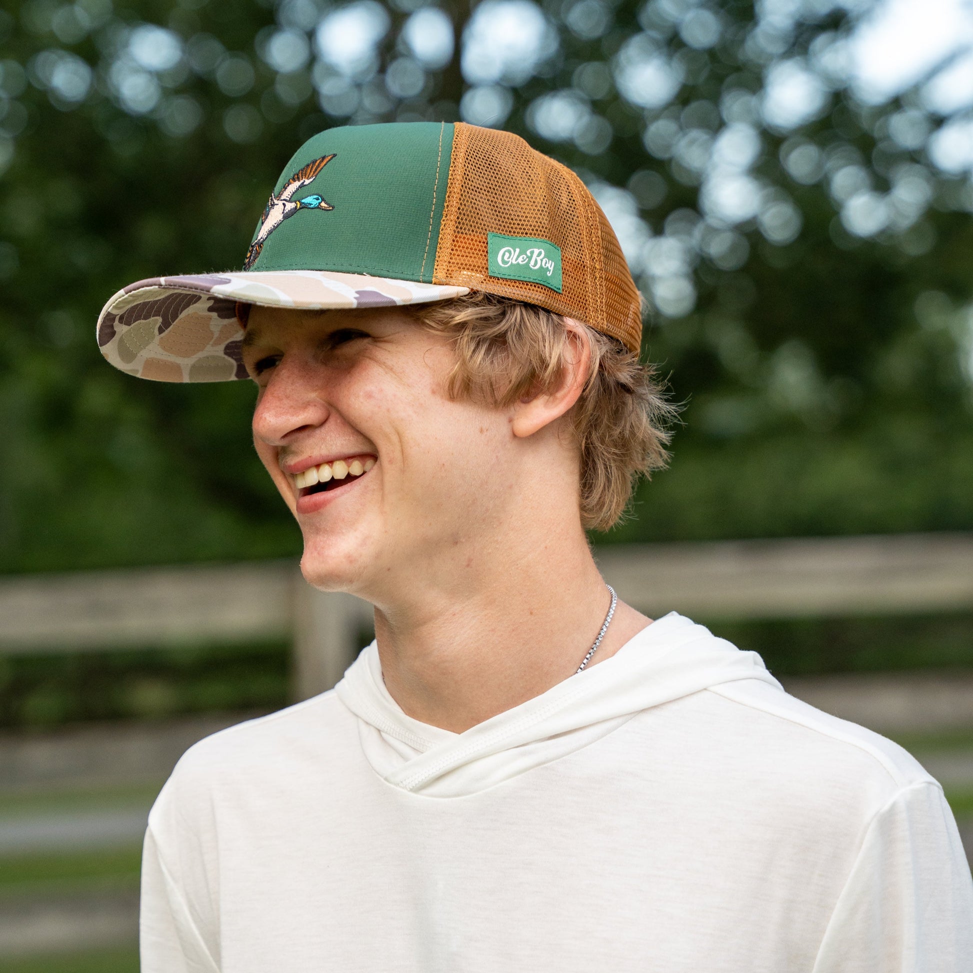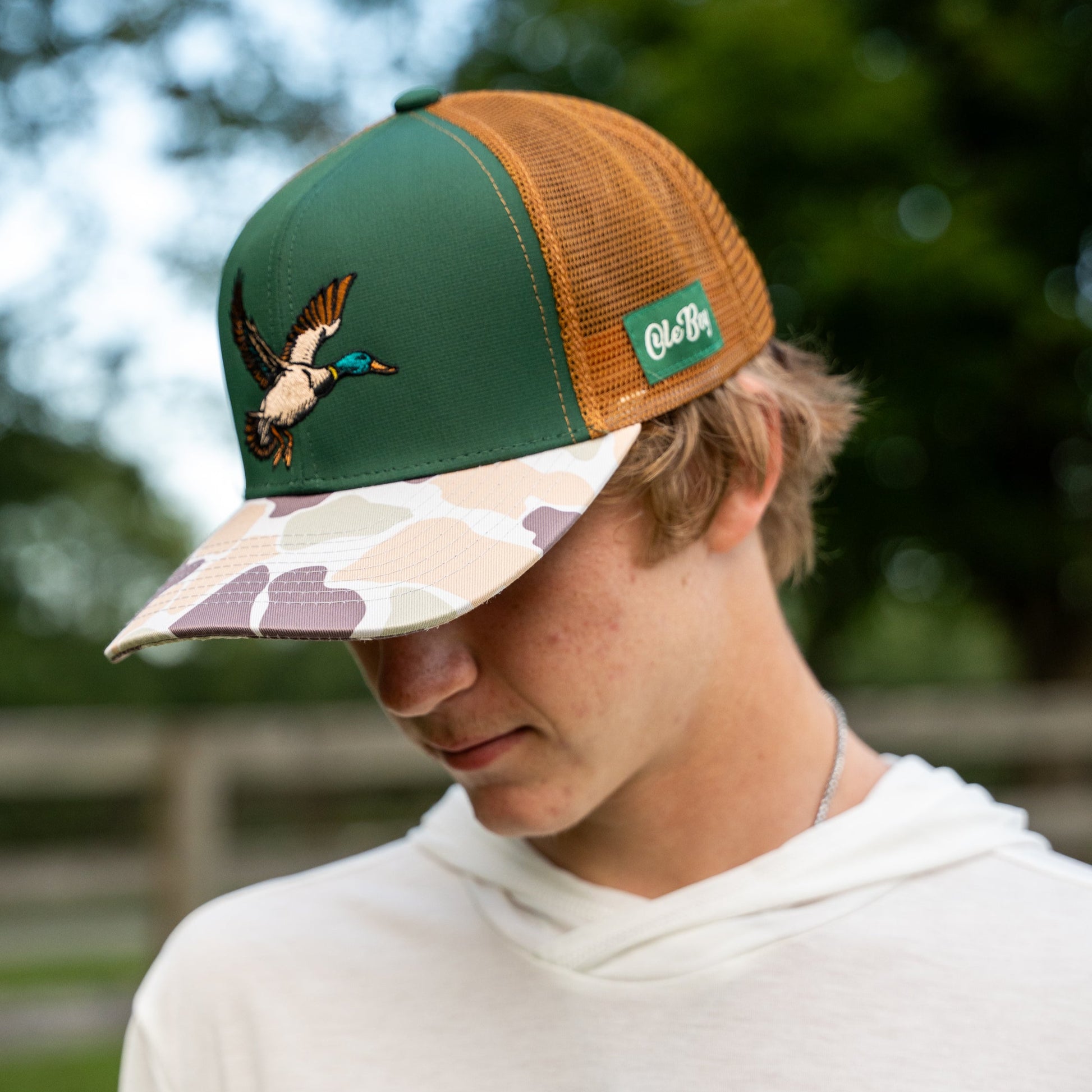 Show off your love for duck hunting with the OLE BOY Flying Mallard Camo Trucker Hat. The embroidered mallard duck on the front and classic Ole Boy logo patch on the side add a touch of outdoorsy style to this hat. Perfect for any hunting adventure, this trucker hat is a must-have for any ole boy. Plus each camo pattern is different on each hat, making yours truly a one of a kind.