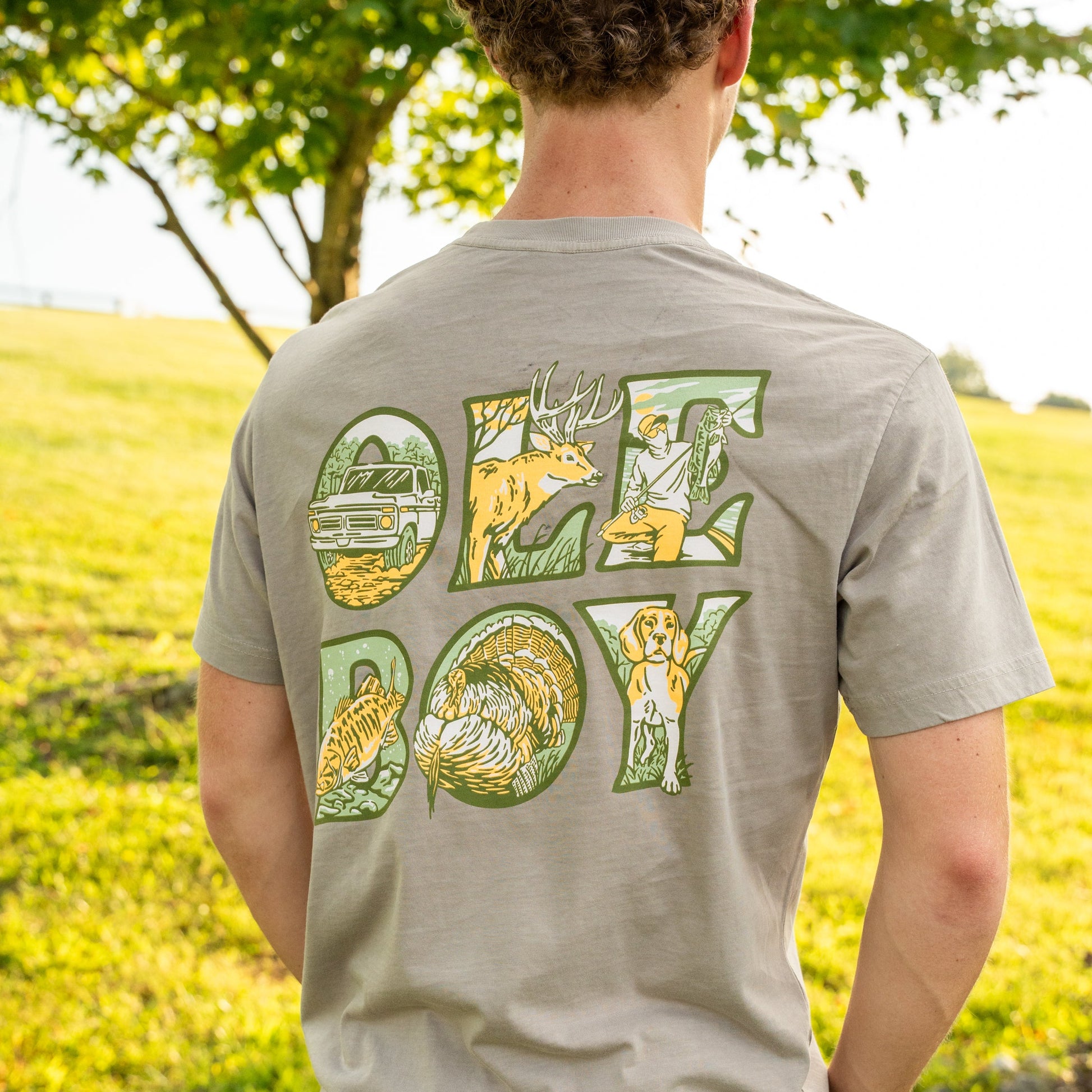 Celebrate the Ole Boy lifestyle with this rugged tee featuring a bold back print showcasing iconic images like a truck, deer, turkey, fishing, and a trusted dog—all cleverly displayed within the letters. Built for comfort and pride, it’s perfect for anyone who lives the Ole Boy way every day.